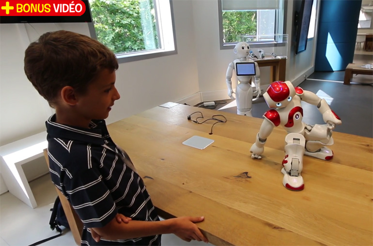 Nao, le petit robot humanoïde, montre à Adriano, l’enquêteur d’Images Doc, comment il se relève après une chute.